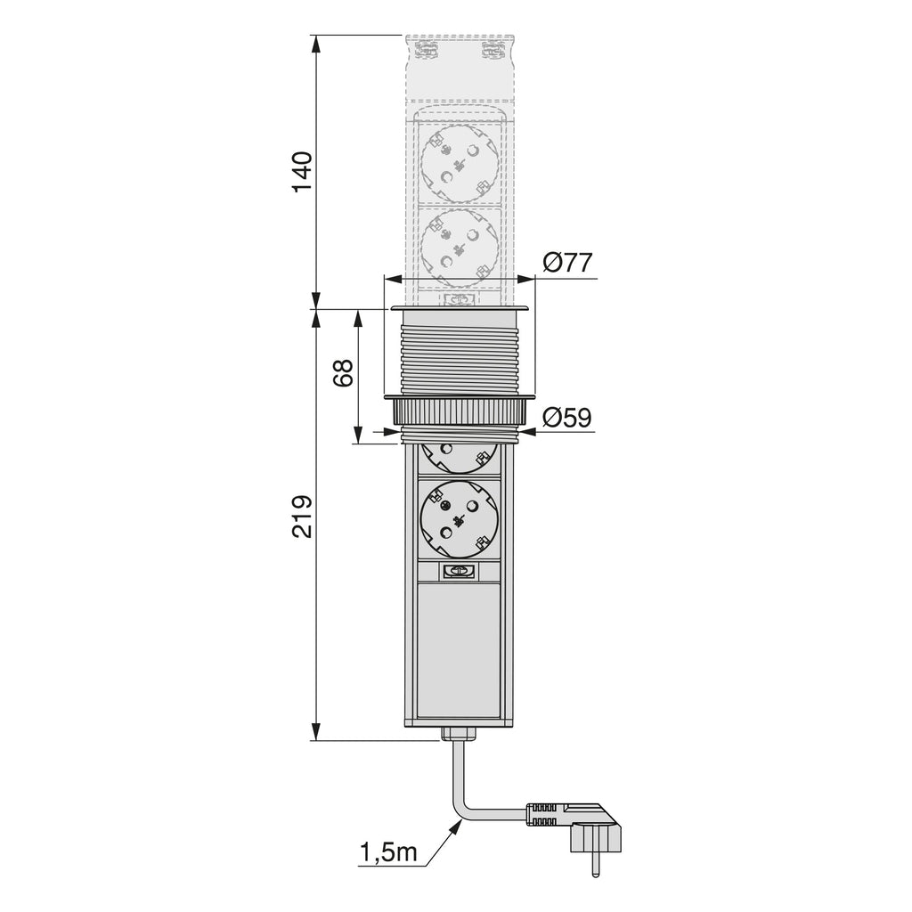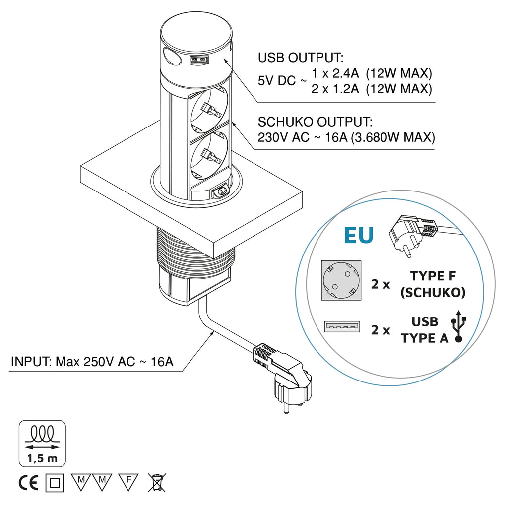 Ce connecteur dispose de deux prises électriques Schuko (EU) de type F avec une puissance maximale autorisée allant jusqu'à 3680W - 16A et de deux connecteurs USB pour une charge rapide d'appareils électroniques 5V DC (1 x 2,4A / 2 x 1,2A) avec une puissance maximale de 12W. Pour utiliser les connecteurs USB, une légère pression sur la surface en acier inoxydable suffit, ce qui les rend tous deux accessibles. Si vous devez ensuite utiliser les prises de courant, vous pouvez tirer le bloc vers le haut pour les rendre accessibles.