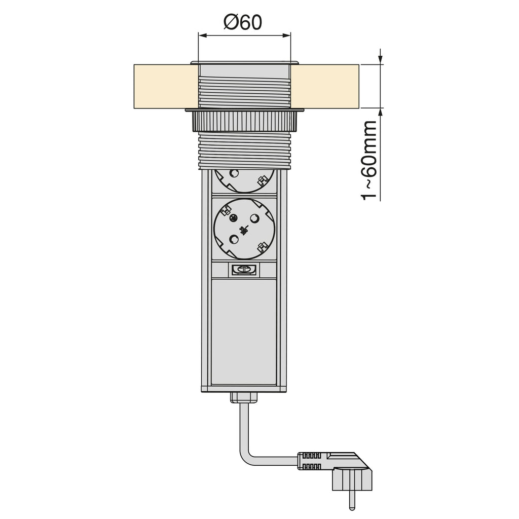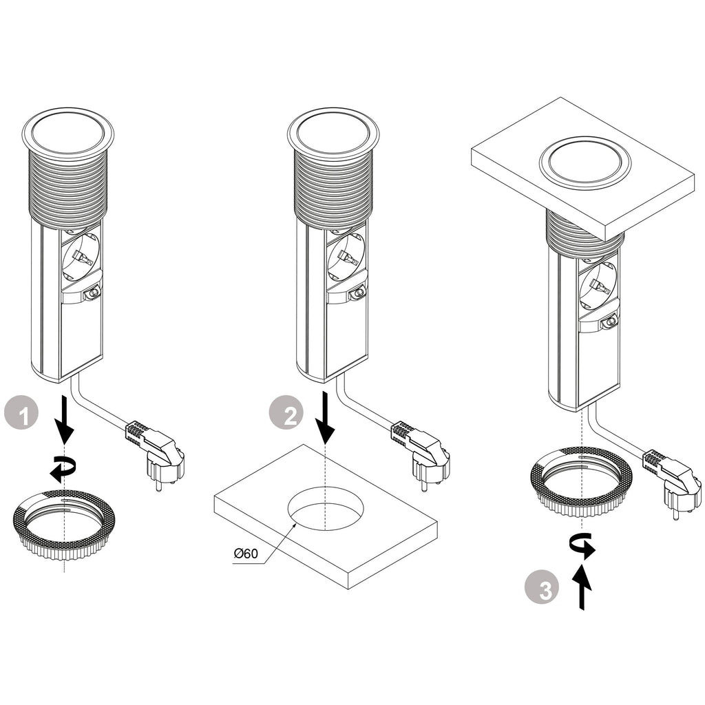 Son installation est très polyvalente puisqu'il ne nécessite qu'un trou de 60 mm de diamètre (il s'adapte parfaitement aux bureaux déjà équipés de presse-étoupes de 60 mm) et peut être monté sur des surfaces très épaisses, entre 1 et 60 mm. Il se fixe également aux meubles sans avoir besoin d'outils grâce à une douille de verrouillage manuel.