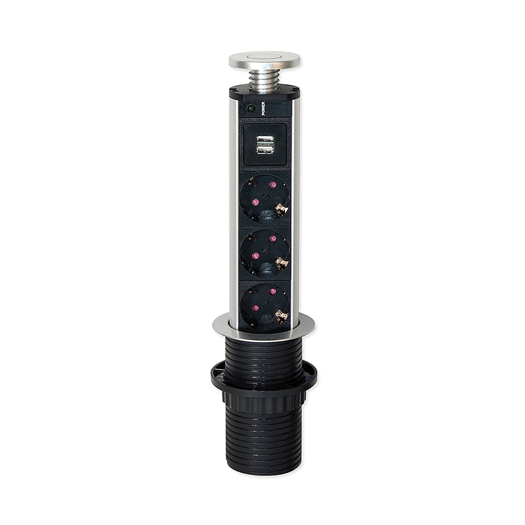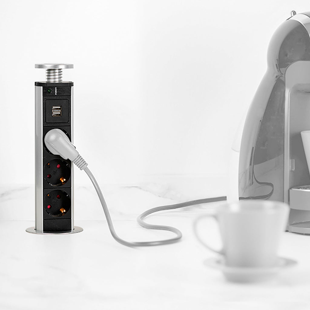 Emuca Multiprise Tourelle Gris Métallique 3 Prises 2 USB Rétractable du Bureau