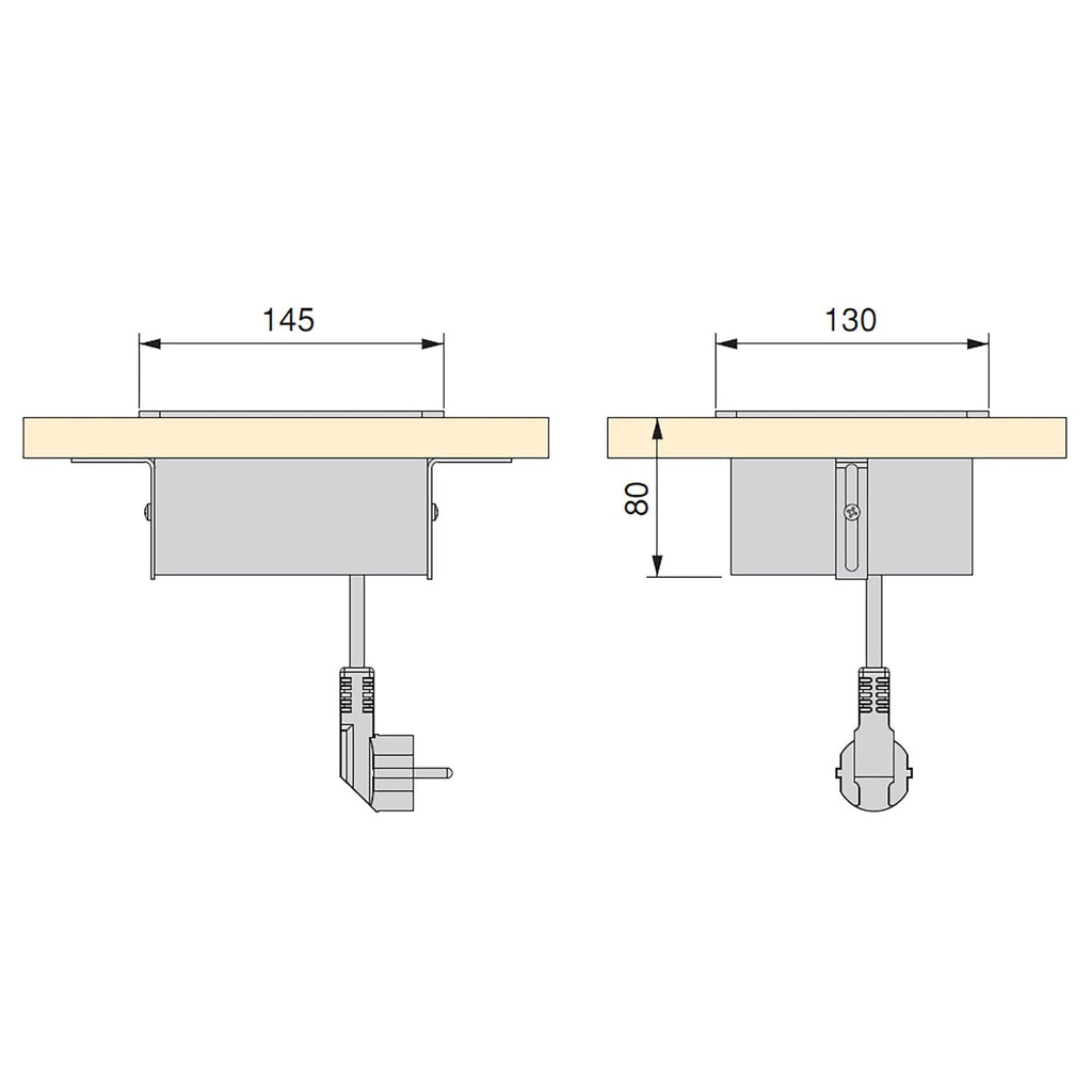 L'installation est très polyvalente car elle comprend des câbles de connexion pour connecter des périphériques sans utiliser d'outils ainsi qu'un câble de 1,5 m avec fiche pour un fonctionnement à 250 V AC 50 Hz . Cela nécessite un traitement dans le panneau et permet de le monter sur des surfaces très épaisses, maximum 36 mm. La fixation au meuble est réalisée avec les équerres et vis incluses dans la fourniture.