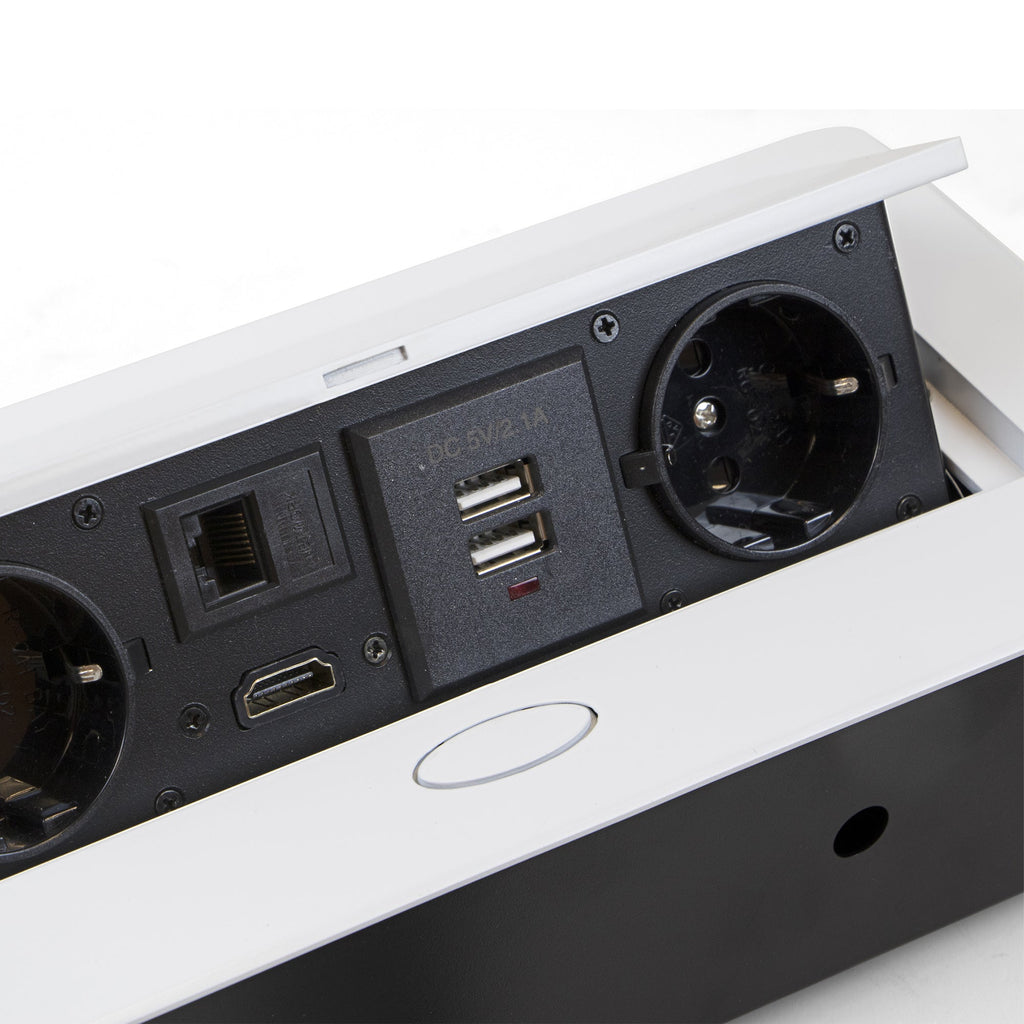 Selon le modèle choisi, il dispose de deux prises Schuko de type F (EU) ou de type G (UK) d'une puissance maximale autorisée allant jusqu'à 3 000 W - 13 A deux connecteurs USB pour charger des appareils électroniques 5 V DC (1 x 2 A / 2 x 1,5A), une entrée réseau RJ45 non blindée et un connecteur HDMI 2.0 .