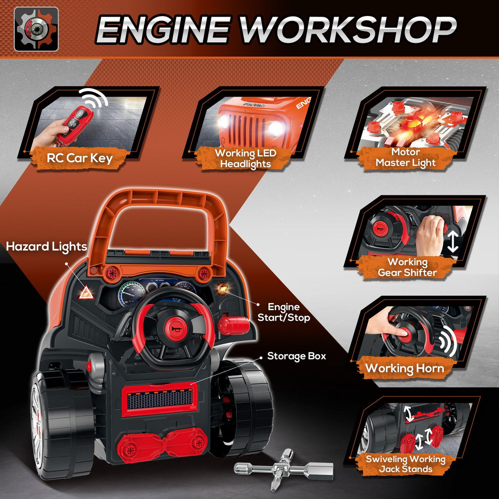 - ATELIER JOUETS : Vos enfants pourront découvrir le fonctionnement d'un moteur. En ouvrant le capot, ils peuvent vérifier l'huile, remplacer les freins à disque, remplacer les bougies d'allumage, réparer les phares, retirer le moteur du jouet et bien plus encore.