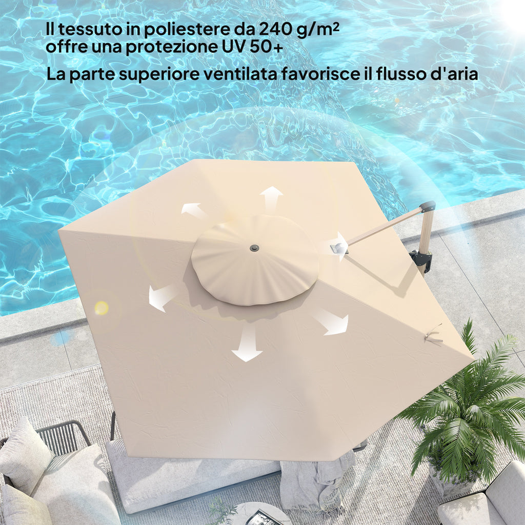 Rivitalizza lo stile del tuo ambiente esterno con questo raffinato ombrellone a sbalzo con base inclusa! Ideale per rilassarsi in terrazza, fare un barbecue in giardino o trascorrere un sereno pomeriggio sul patio, la struttura offre un'ampia zona d'ombra e protezione UV50+ per restare sempre freschi e protetti dai raggi UV. Grazie ai 5 angoli di inclinazione e alla base rotante a 360°, puoi regolare facilmente l'ombra e goderti il massimo comfort in ogni momento del giorno.