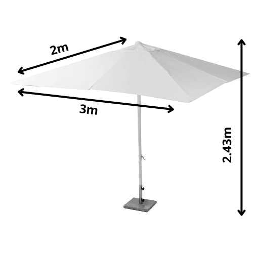 Il nostro ombrellone è caratterizzato da una struttura resistente in alluminio verniciata a polvere di colore bianco, con una copertura in tessuto poliestere idrorepellente bianco panna. Dotato di camino di ventilazione e manovella di apertura e inclinazione, questo ombrellone ha un'altezza massima di 2,43 metri e un palo dal diametro di 38mm. Le 6 stecche in alluminio quadrate e la verniciatura idrorepellente garantiscono durata e resistenza, anche se è sprovvisto di base.