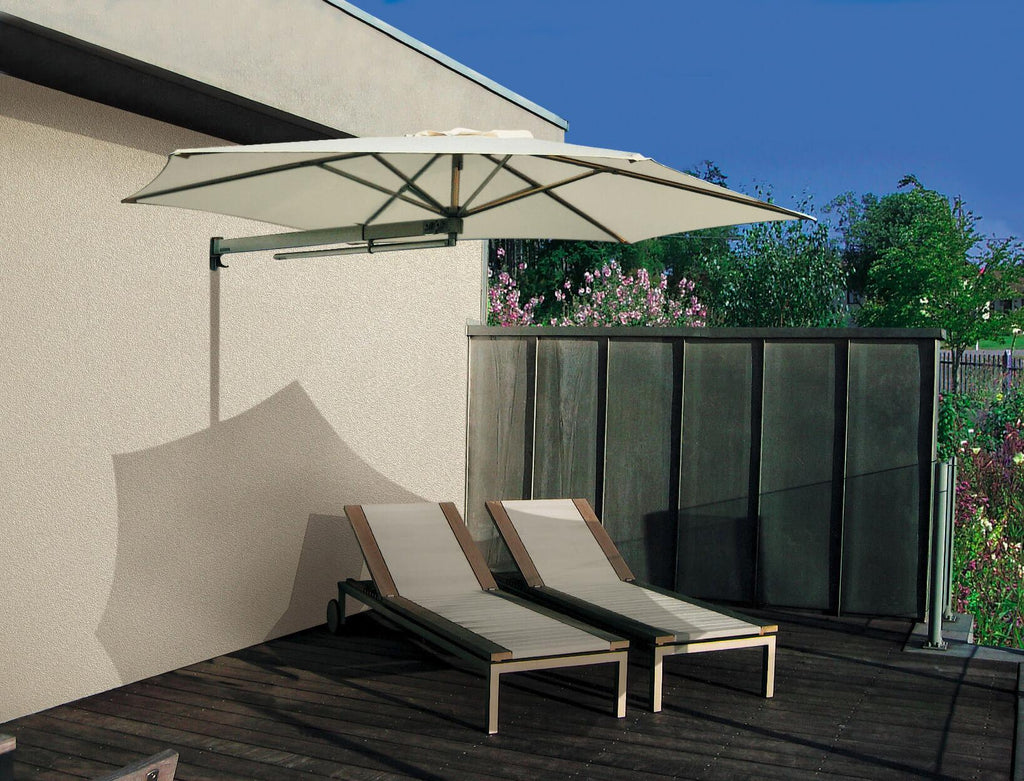 Parasol de jardin Parrot P3 avec bras télescopique à appliquer au mur. Le bras peut être allongé de 1,40 m à 1,80 m et peut pivoter horizontalement. Il se détache rapidement du support mural, très résistant et facile à manipuler.