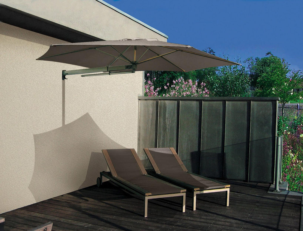 Parasol de jardin Parrot P3 avec bras télescopique à appliquer au mur. Le bras peut être allongé de 1,40 m à 1,80 m et peut pivoter horizontalement. Il se détache rapidement du support mural, très résistant et facile à manipuler.
