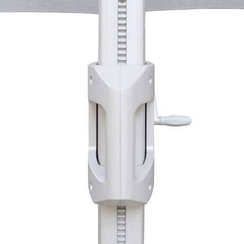 Ombrellone in alluminio color silver con copertura in tessuto axroma impermeabile grigio. Struttura con verniciatura a polvere, funzione di inclinazione, ghiera laterale regolabile e basculante laterale. Dotato di base a rotazione a 360° e base a croce, escluse le pianelle di fissaggio. Inclusa cover per proteggerlo quando non in uso.