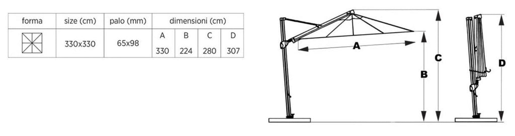 - Ouverture 3,3 x 3,3 m surface totale de l'ombrage 11 m2