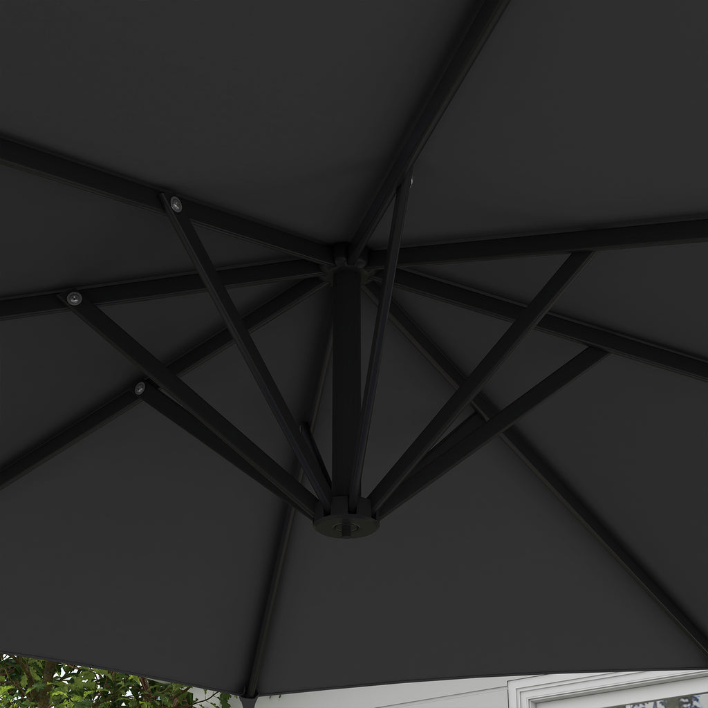 - Ombrellone decentrato realizzato con un tessuto in poliestere di qualità e un telaio in acciaio verniciato a polvere per garantire la stabilità