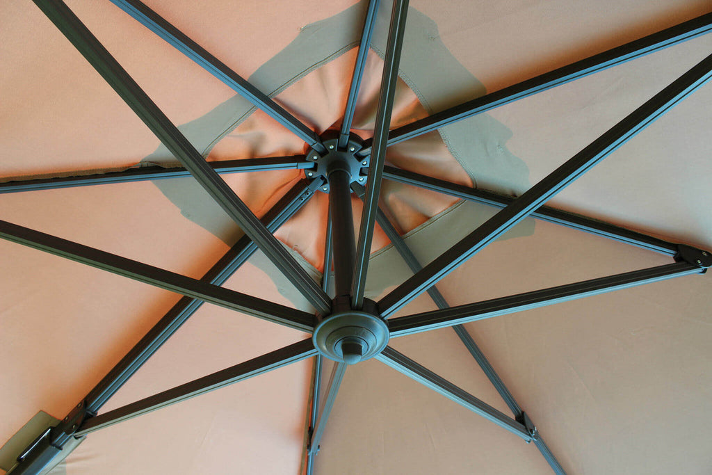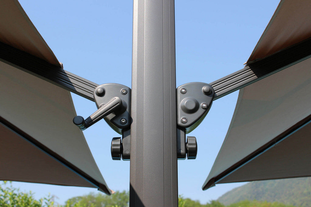 Parasol de jardin double Archimede 3x3m en aluminium anthracite avec serviette gris tourterelle