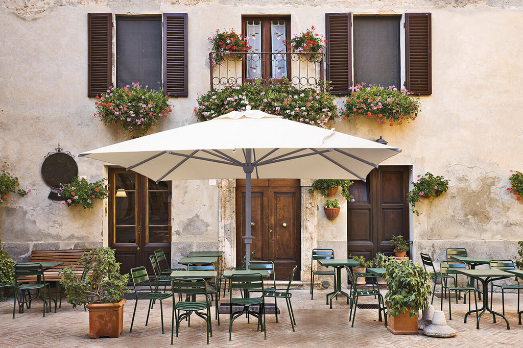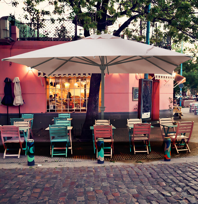 Les dimensions moyennes/grandes de ce modèle en font l'un des produits les plus polyvalents de la gamme et le design sobre et raffiné favorise sa combinaison avec tout type de mobilier et d'environnement. Pour son ancrage, il est possible de choisir la base en croix en acier fixée au sol, ou la base avec des éléments en marbre poli qui, grâce à l'épaisseur de 8 cm et au poids total de la base de 160 kg, la rendent particulièrement stable. Le système d'ouverture et de fermeture est, malgré la taille du parapluie, très rapide et simple grâce à un système innovant basé sur le contrepoids et activé d'un seul mouvement.