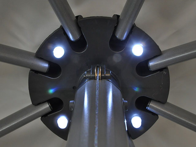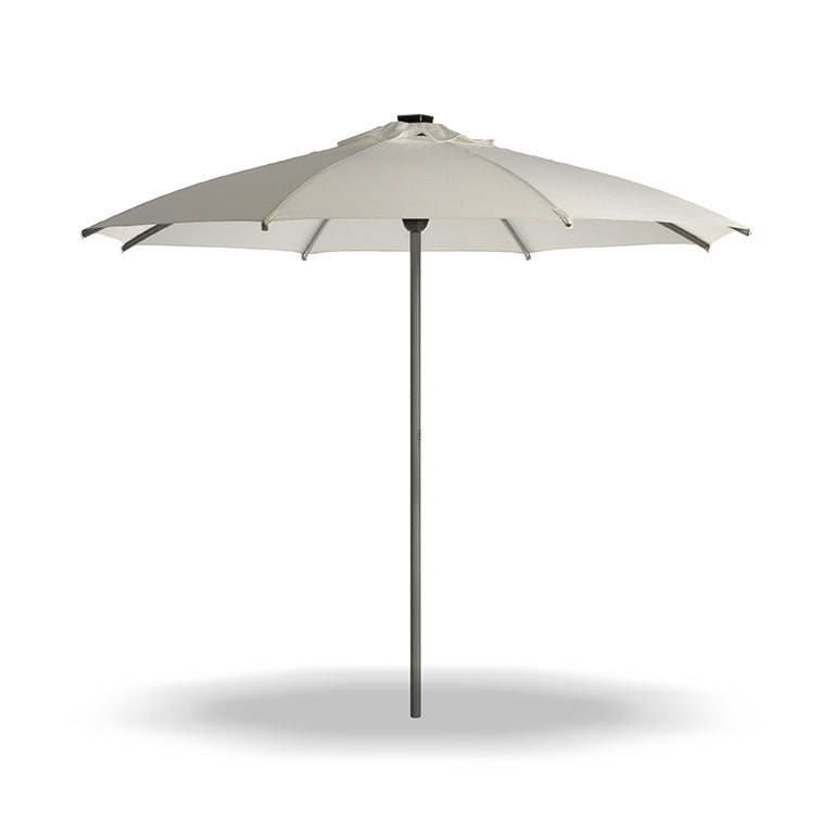 Parasol rond avec système d'ouverture/fermeture automatique, panneau solaire intégré pour maintenir la charge de la batterie nécessaire à l'ouverture/fermeture et éclairage LED, télécommande d'ouverture/fermeture incluse.Structure en aluminium, 8 baleines, tissu polyester gr. 250/m².
