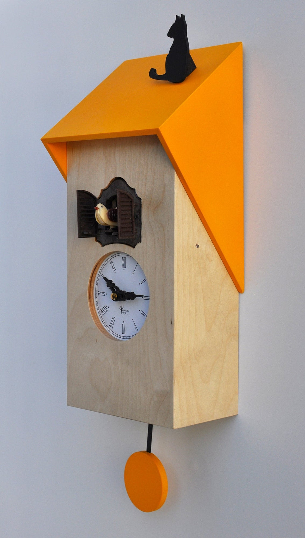 Horloge à coucou murale 17x37x12 cm Pirondini Italie Vicenza avec chat naturel et jaune.