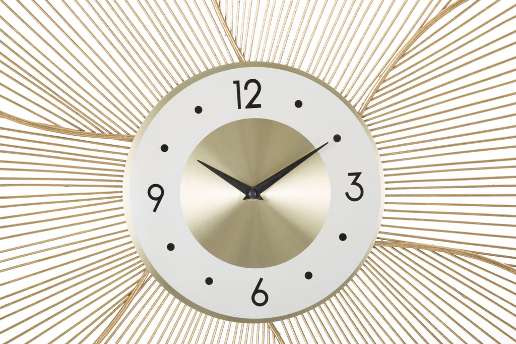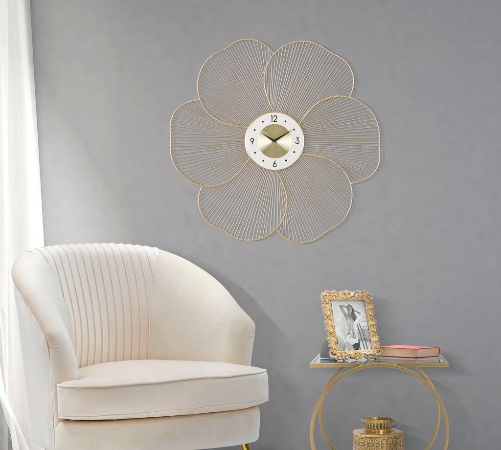 Élégante horloge murale en métal doré en forme de fleur qui donne une touche de classe qui fait référence à la nature.