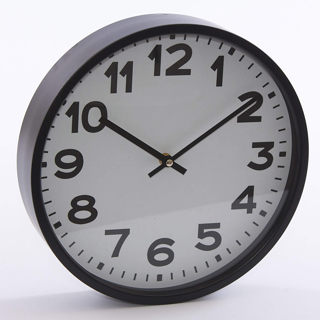 Horloge murale classique. Cadre noir épais. La pile requise, de type AA, n'est pas incluse dans la livraison. Livraison sans matériel de fixation.