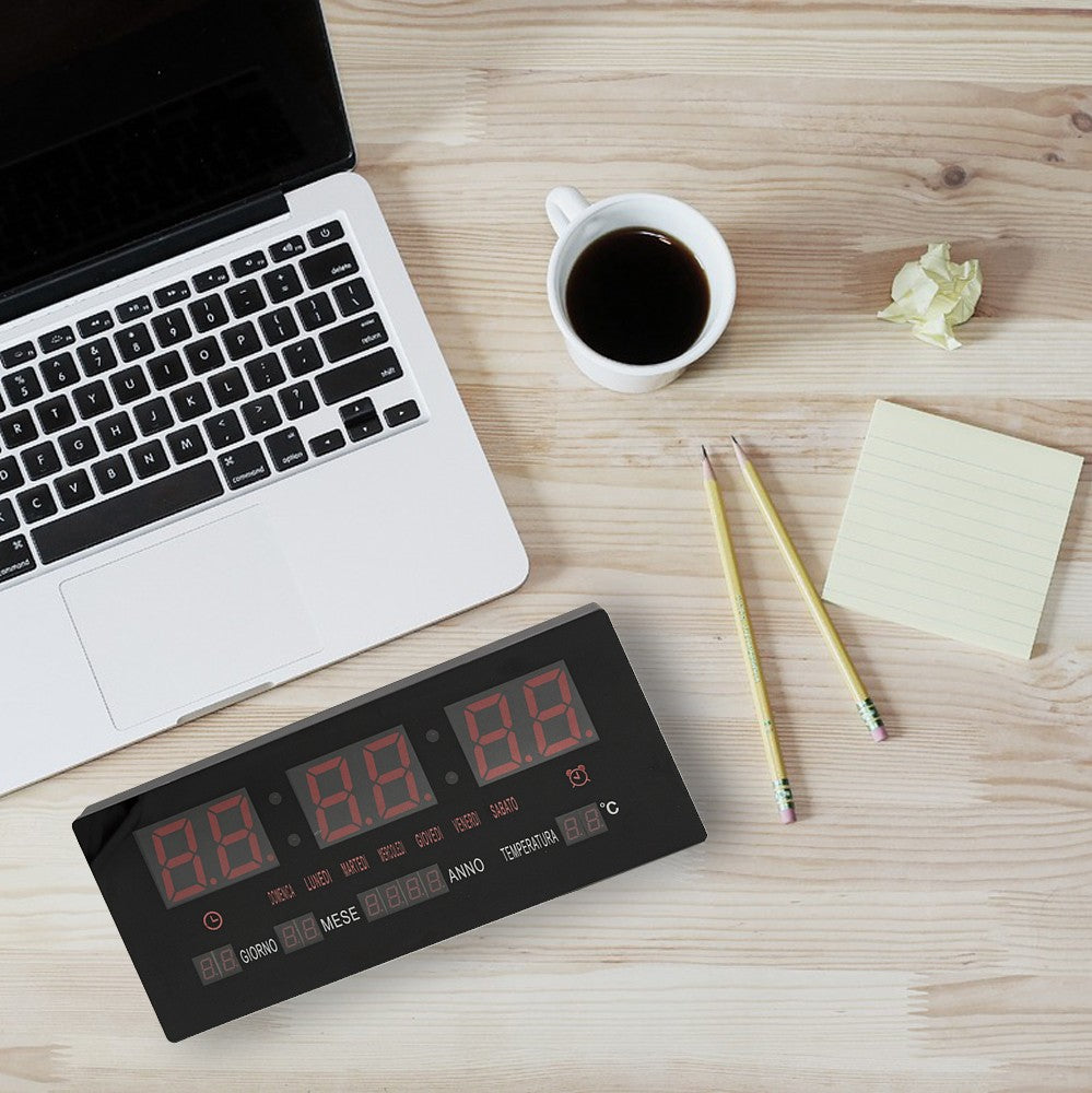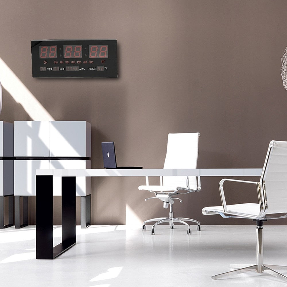 Horloge murale numérique au design moderne qui permet de lire l'heure même à distance.Le grand écran LED rend toutes les informations claires et faciles à lire : enfin vous aurez toutes les informations relatives à l'heure dans votre bureau ou chez vous , date et température toujours en vue. Idéal pour les bureaux, les chambres, les salons, les gymnases ou les magasins. Facile à monter au mur ou à poser sur votre bureau, vous serez libre de le placer dans n'importe quel environnement grâce à son design simple et moderne qui le rend esthétiquement adapté à tout type de mobilier.