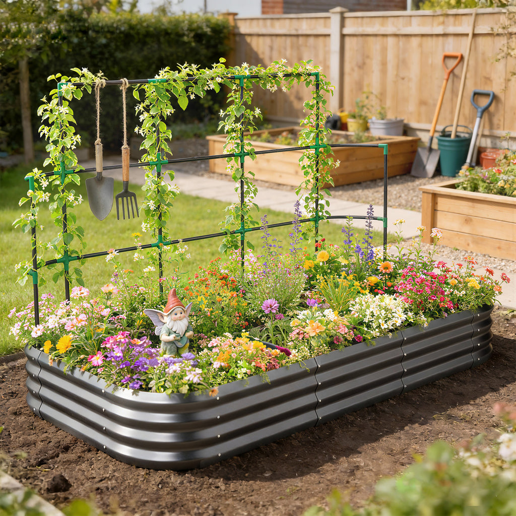 Dai al tuo giardino il giusto supporto con l'aiuola rialzata in metallo. Il traliccio consente la crescita di piante rampicanti e il posizionamento di decorazioni. La struttura in metallo galvanizzato resiste a sole, pioggia e neve. Pannelli modulari adattano l'aiuola al tuo spazio. Il fondo aperto migliora drenaggio e previene marciume delle radici, favorendo la crescita delle piante ogni stagione.