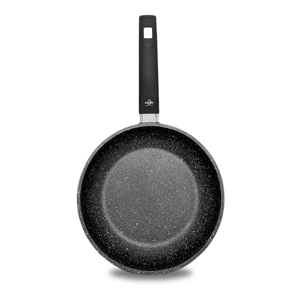 Alta resistenza e massima antiaderenza. Il rivestimento è antiaderente multistrato e rinforzato da particelli minerali, con finitura effetto pietra ; adatto al contatto alimentare per una cucina sana salutare e senza l'utilizzo di grassi.