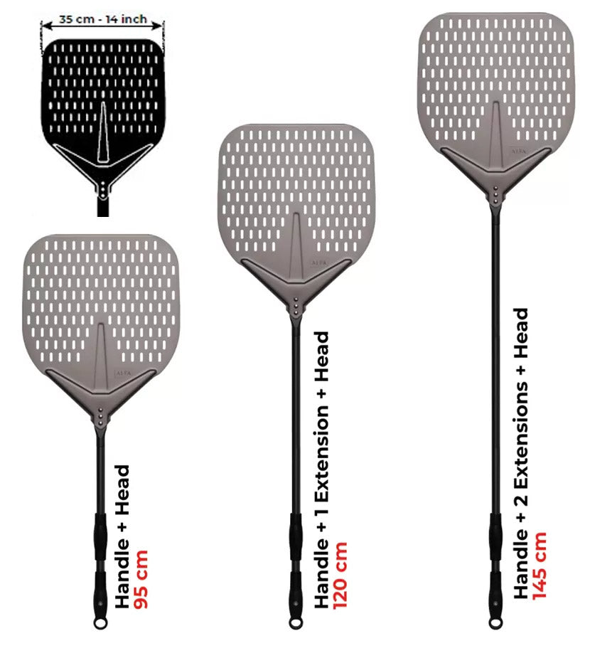 La longueur de la pelle à pizza Alfa peut donc être modifiée de temps en temps en choisissant entre 95 cm (manche + tête), 125 cm (manche + 1 rallonge + tête) ou 145 cm (manche + 2 rallonges + tête).
