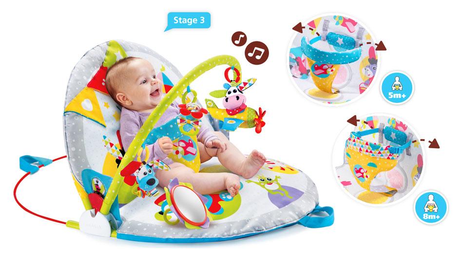 Lorsque l'enfant commence à apprendre à s'asseoir, la salle de gym électronique se transforme en un siège confortable où il peut jouer pendant des heures, en s'amusant avec les jeux et les diverses marionnettes incluses. De plus, grâce à sa taille, les parents peuvent pointer vers divers dessins et personnages inventant des histoires et des contes.