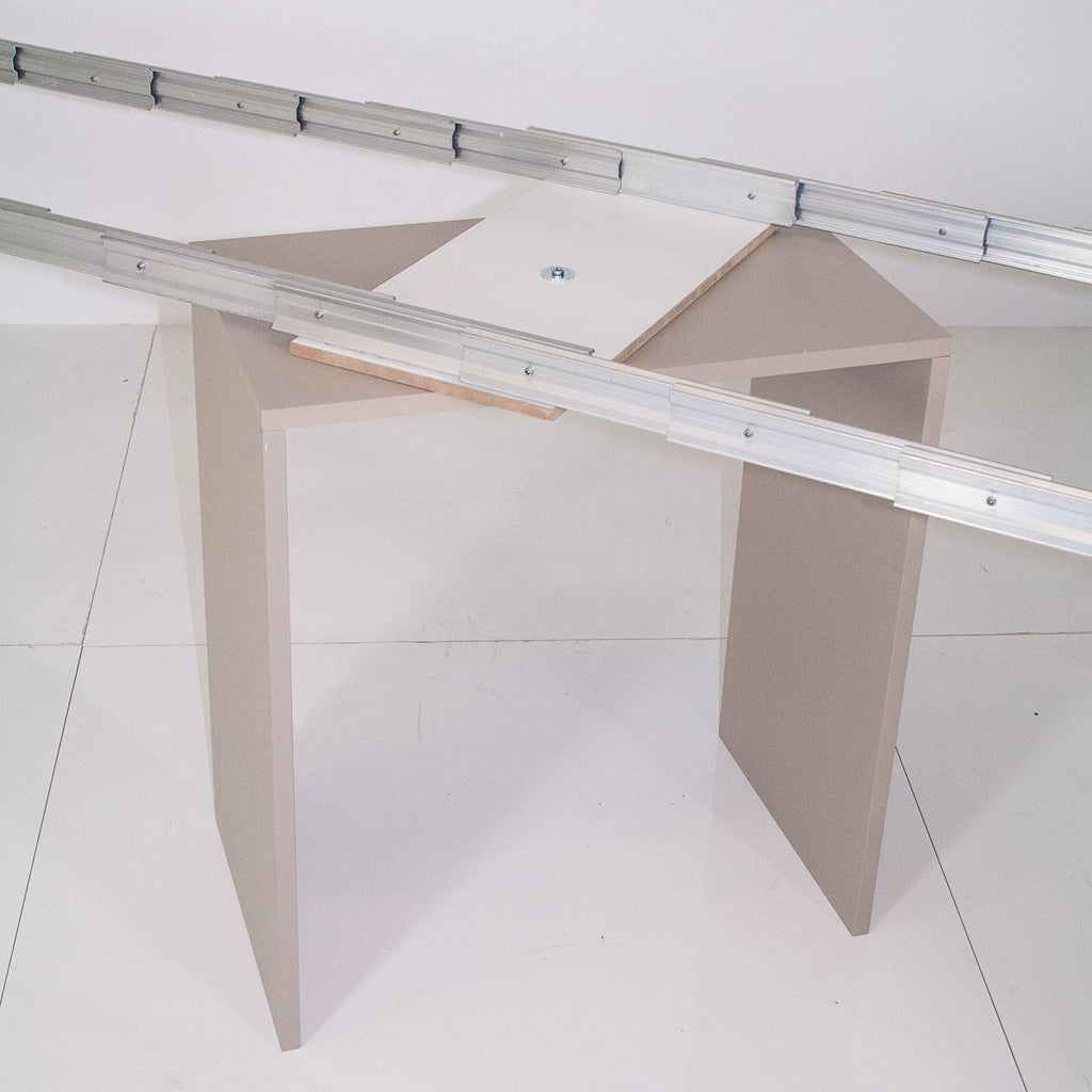 Table console extensible Box, plateau structure et rallonges en panneaux mélaminés.