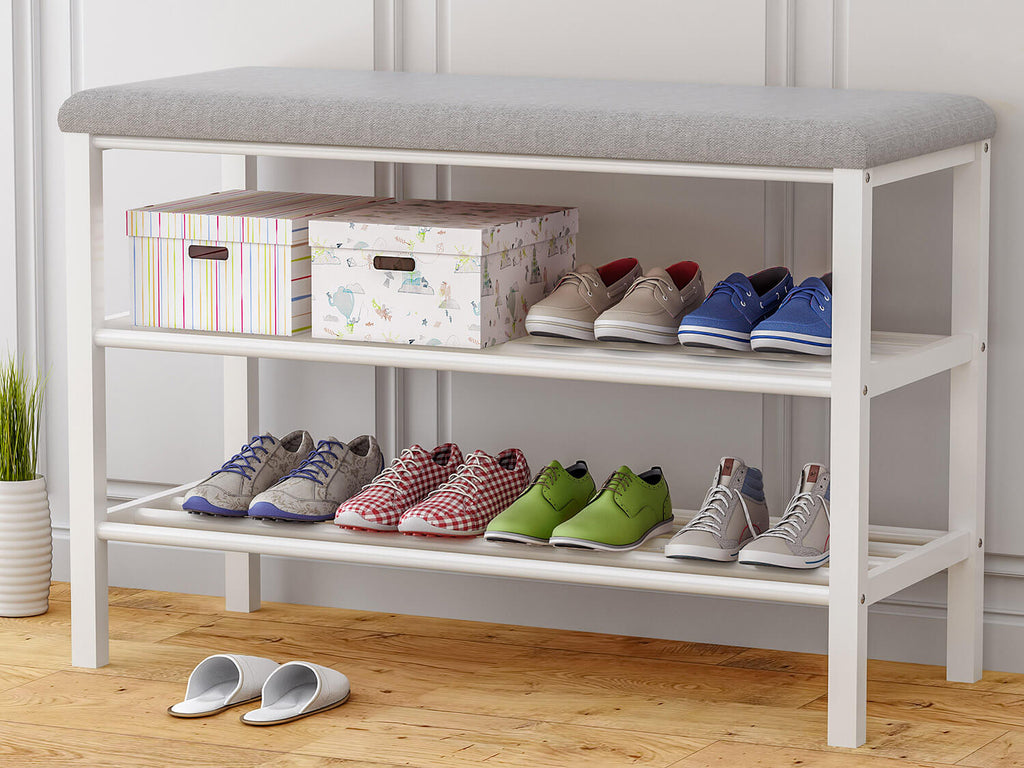 Banc d'entrée avec siège rembourré recouvert de tissu et 2 étagères pour chaussures.