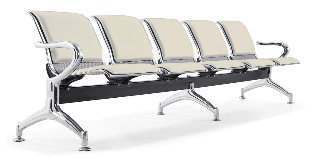 Banc de salle d'attente 5 places pour bureau avec coussin en acier et simili cuir argent/ivoire
