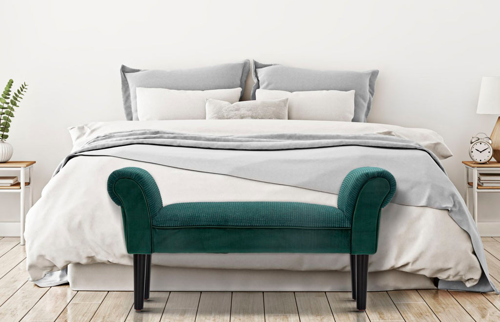 Elégant banc en bois et tissu tapissé vert. De simples pieds en bois noir complètent le siège, donnant une touche de classe et de simplicité à votre maison.