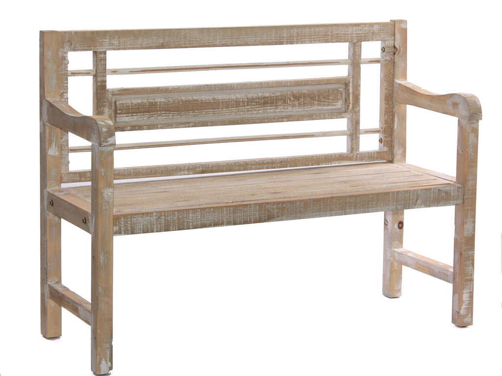 Banc en bois de sapin avec marqueterie élégante sur le dossier. Avec ses 115 cm de longueur, ce banc accueille confortablement 2 personnes. Parfait pour se détendre et discuter avec un ami dans la cour, le jardin ou le balcon, ou pour une utilisation en intérieur. Le produit est livré démonté. Assemblage simple. Un livret d'instructions est fourni.