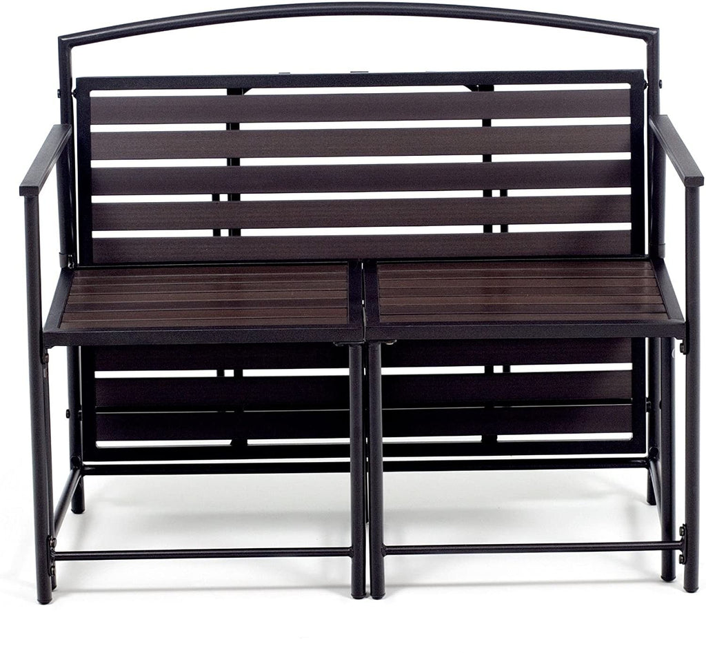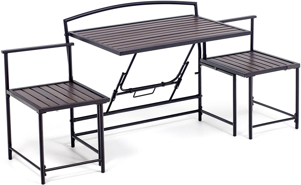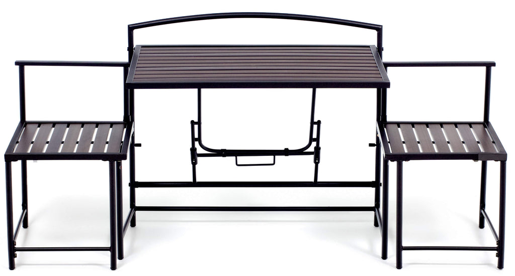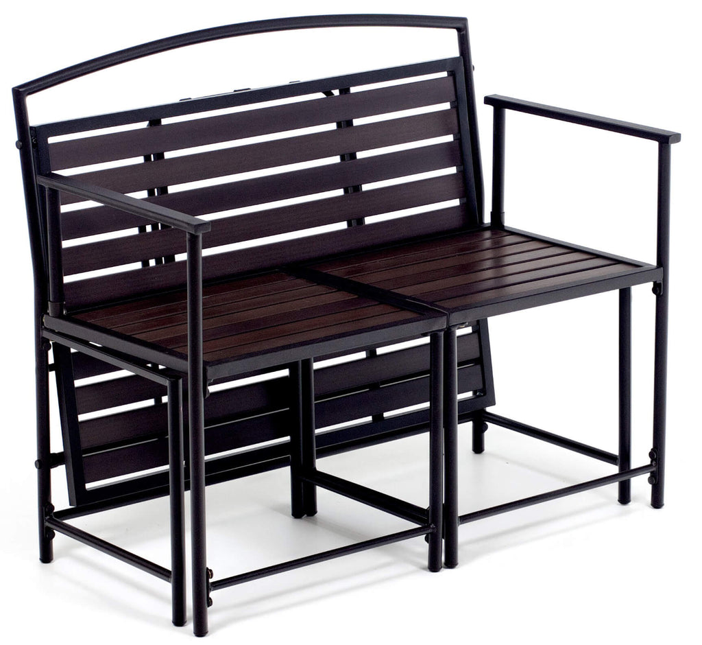 Fonction pliante pour transformer le banc en un ensemble repas composé de 2 tabourets et 1 étagère centrale.