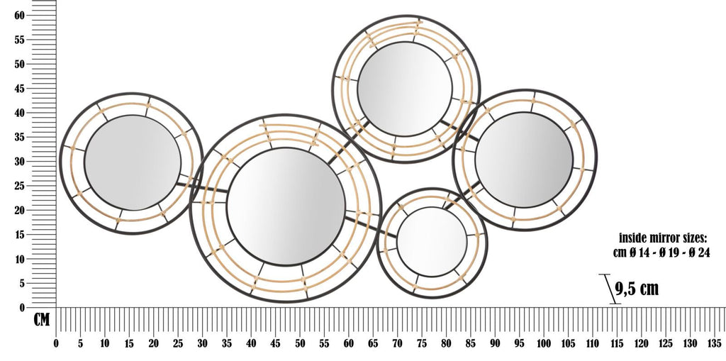 - Il pannello da muro è composto da cerchi di diverse dimensioni con specchietti e finiture in rattan