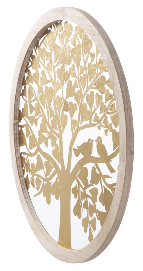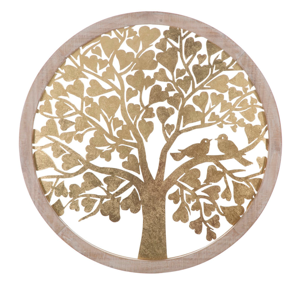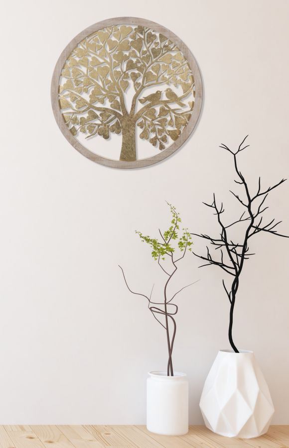 Panneau d'arbre en métal doré avec cadre rond en bois. Les panneaux 3D sont la nouvelle tendance en matière de décoration murale. Le métal se décline en formes géométriques, végétales ou animales qui donnent une allure glamour et surprenante à n'importe quelle pièce.