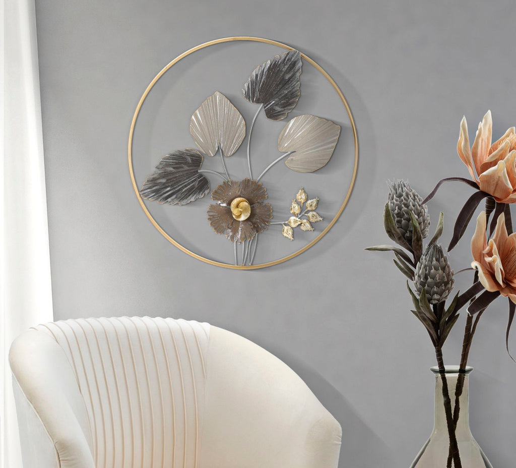 Questo pannello decorativo circolare è un'opera d'arte tridimensionale che cattura l'attenzione con la sua composizione di foglie e fiori. I colori pastello scelti per le decorazioni si fondono armoniosamente con l'oro della struttura, creando un contrasto delicato ma elegante. Questo elemento decorativo aggiungerà classe e stile ad ogni parete su cui verrà collocato.
