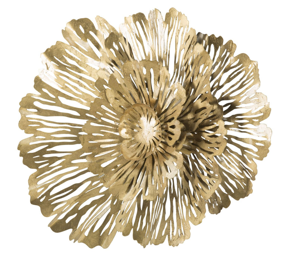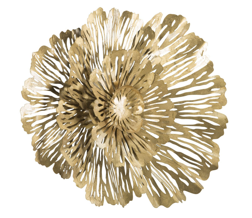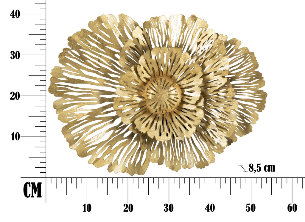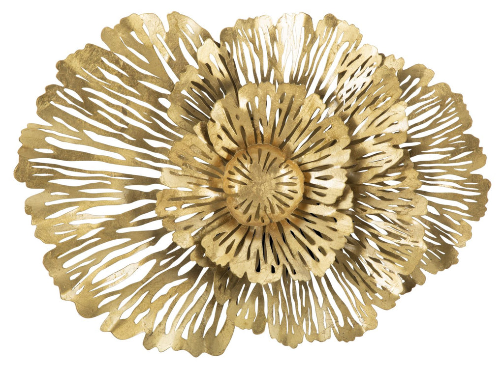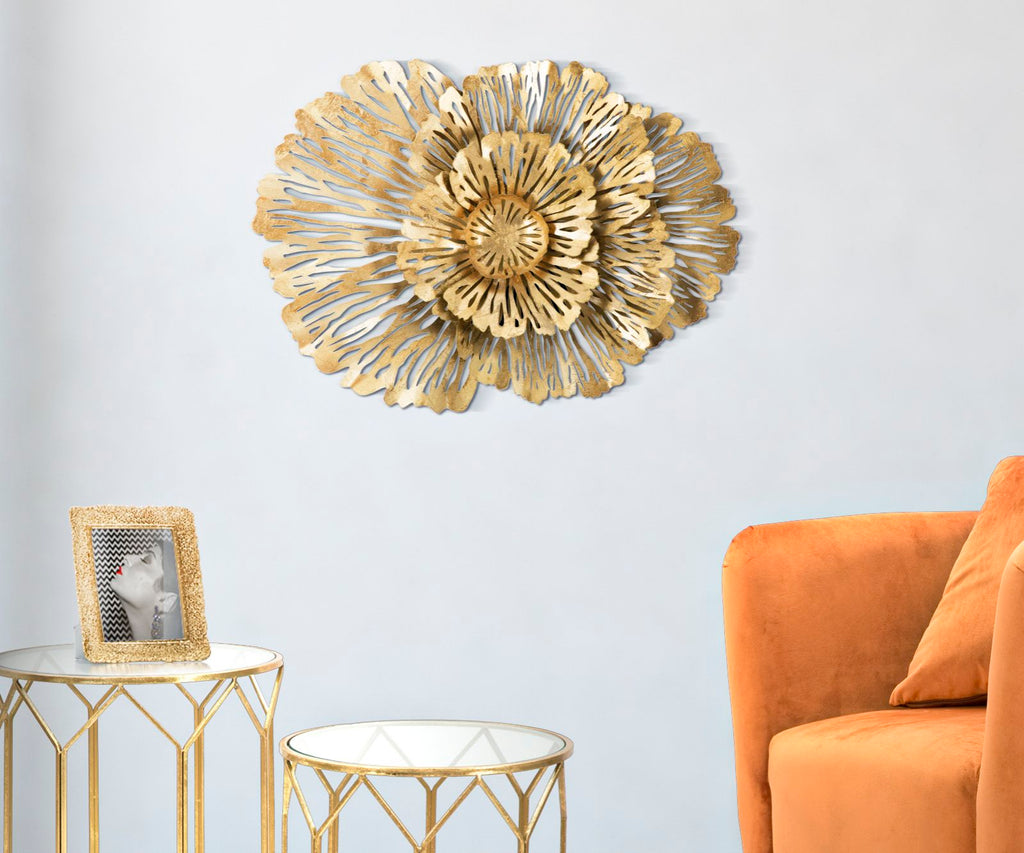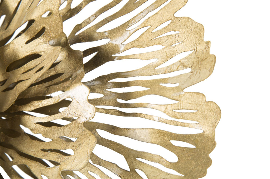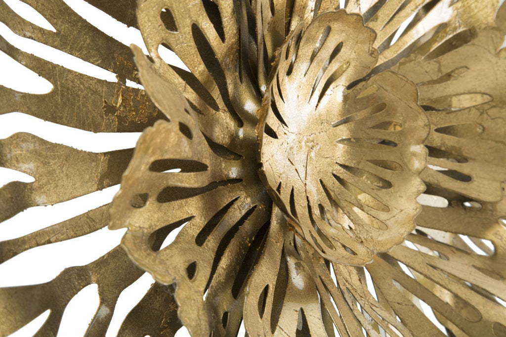 Panneau fleuri en métal doré. Les panneaux 3D sont la nouvelle tendance en matière de décoration murale. Le métal laqué se décline en formes géométriques, végétales ou animales qui donnent une allure glamour et surprenante à n'importe quelle pièce.