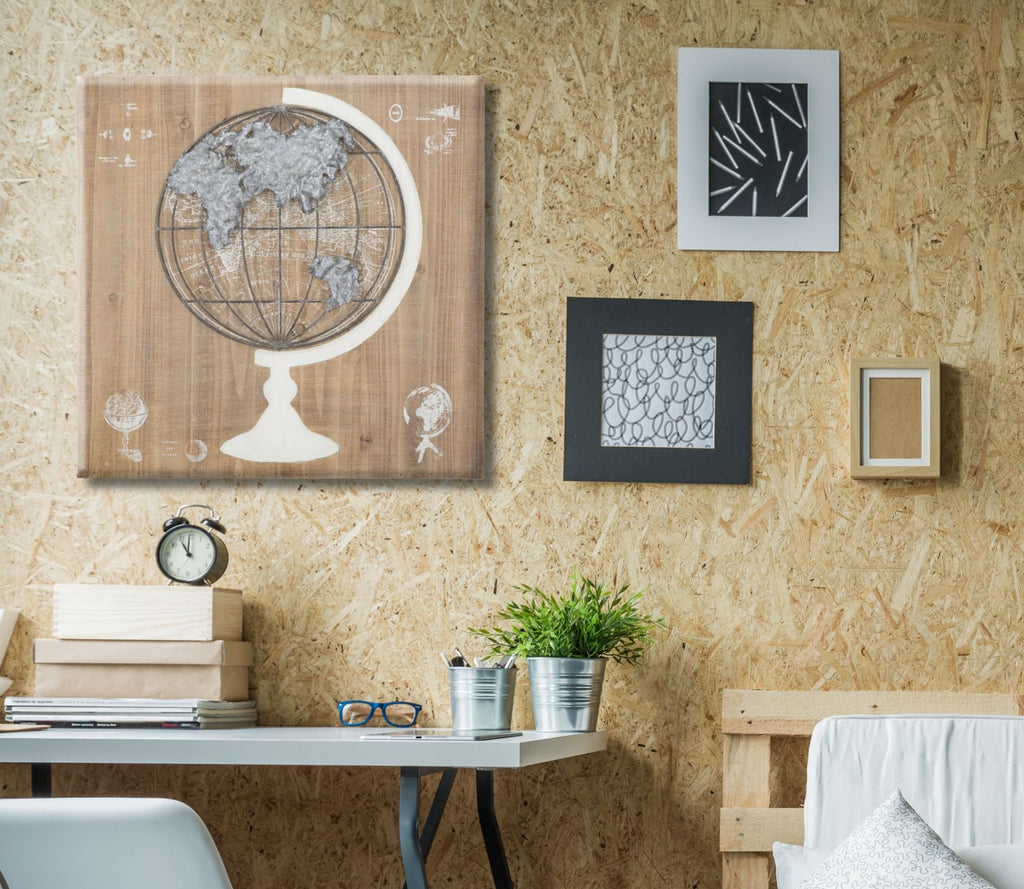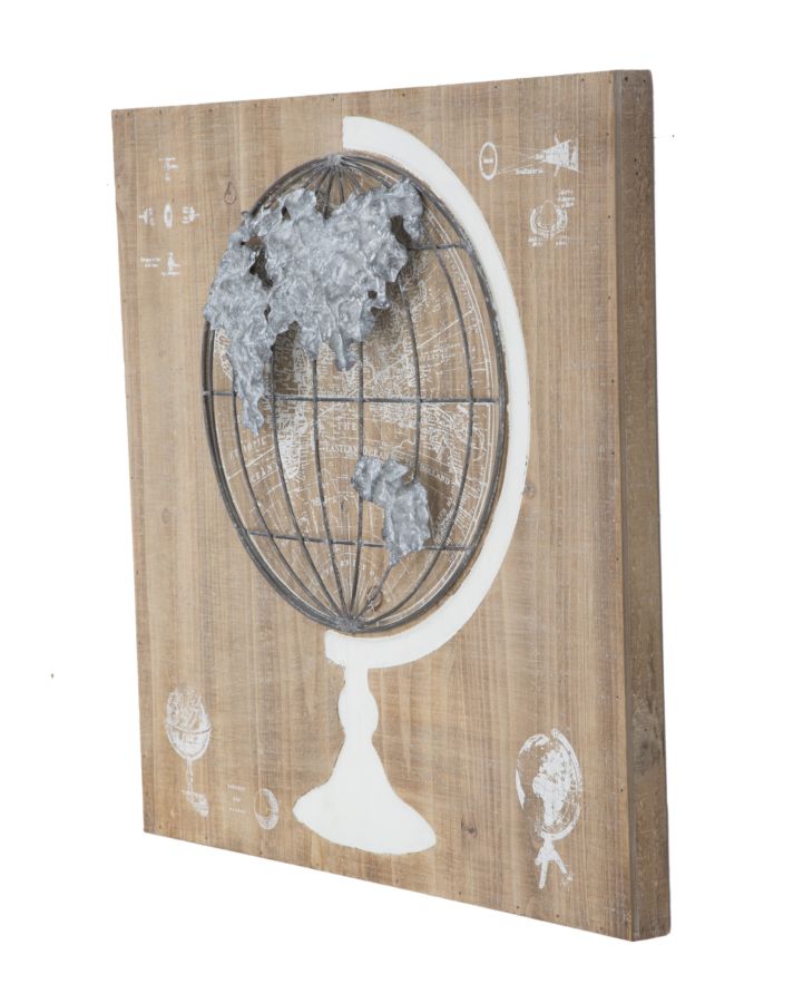 Panneau en bois avec carte du monde en métal. Les panneaux de bois et de métal habillent les murs de la maison d'un style vintage et intemporel