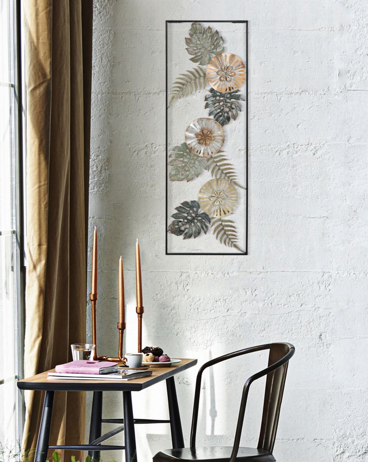 Panneau rectangulaire avec feuilles en métal. Les panneaux 3D sont la nouvelle tendance en matière de décoration murale. Le métal laqué se décline en formes géométriques, végétales ou animales qui donnent une allure glamour et surprenante à n'importe quelle pièce.