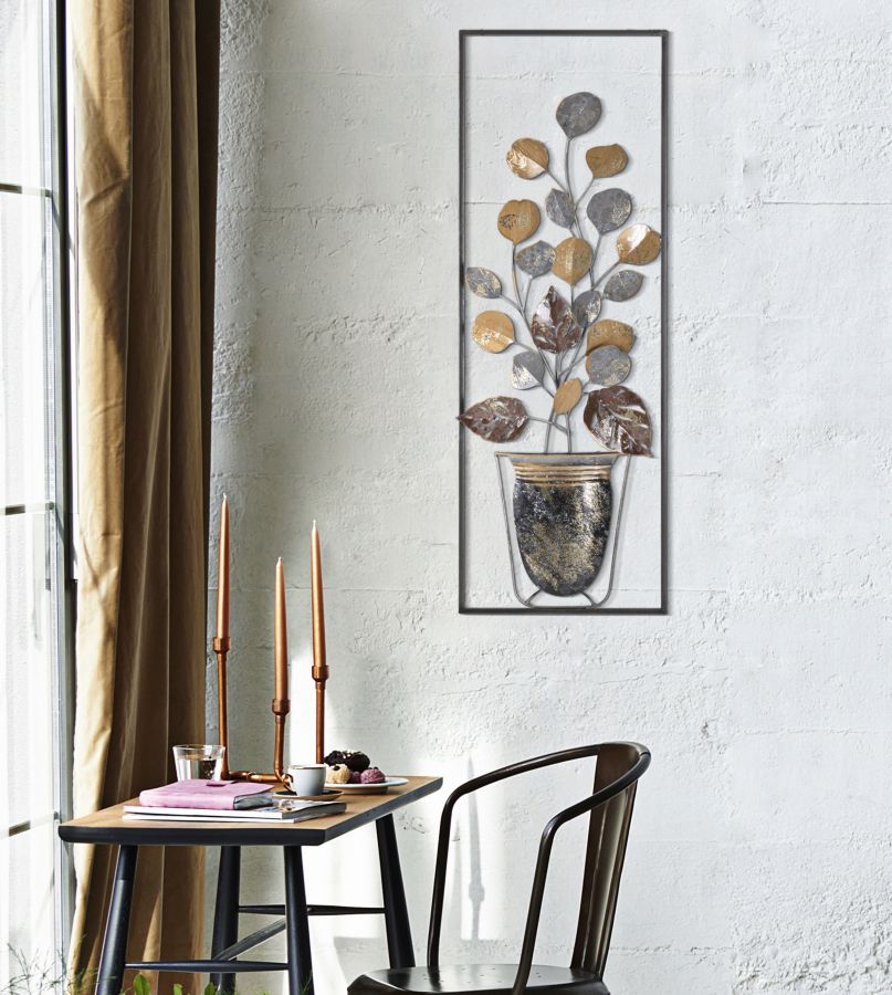 Panneau métallique figurant un vase de fleurs. Les panneaux 3D sont la nouvelle tendance en matière de décoration murale. Le métal laqué se décline en formes géométriques, végétales ou animales qui donnent une allure glamour et surprenante à n'importe quelle pièce.