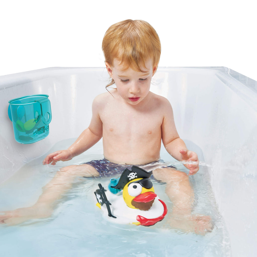 - Avec un récipient pratique qui se fixe à la baignoire pour ranger le jeu dans l'ordre