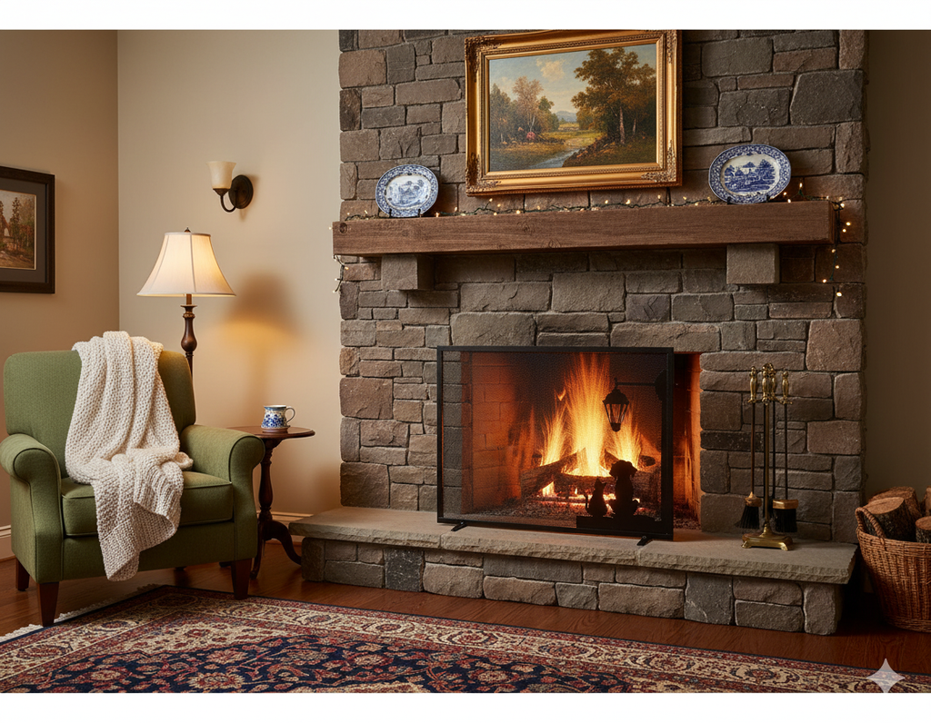 Parascintille per caminetto realizzato con piatto in ferro mm 15x5 e rete stirata in ferro Sp. mm 0.8, verniciato colore grigio martellato, con tema decorativo rappresentante cane e gatto sp. mm 2, Made in Italy, facile da pulire con un panno umido, montaggio non richiesto.
