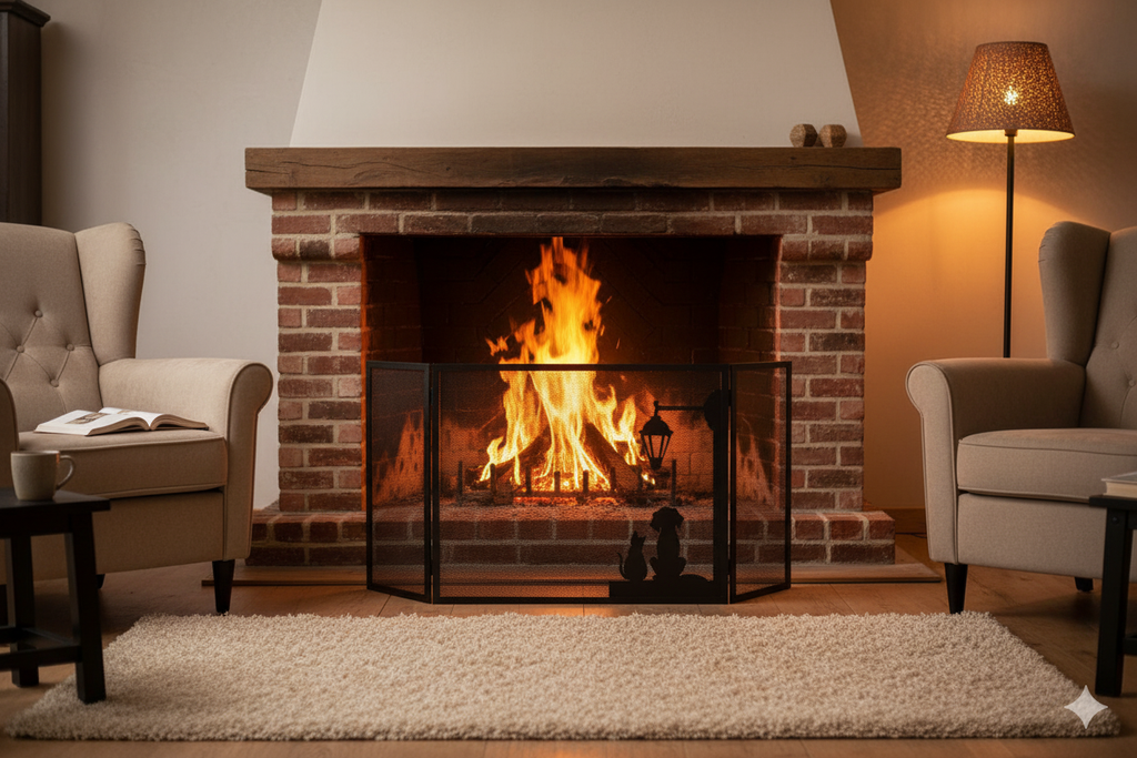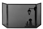 Parascintille per caminetto con parte centrale e 2 antine, realizzato con piatto in ferro mm 15x5 e rete stirata in ferro Sp. mm 0.8, verniciato colore grigio martellato, con tema decorativo rappresentante cane e gatto sp. mm 2, Made in Italy, facile da pulire con un panno umido, montaggio non richiesto.