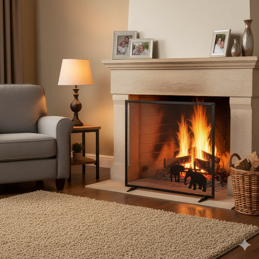 Parascintille per Camino 60x50 cm Decorazione Elefante in Ferro Verniciato Grigio Martellato