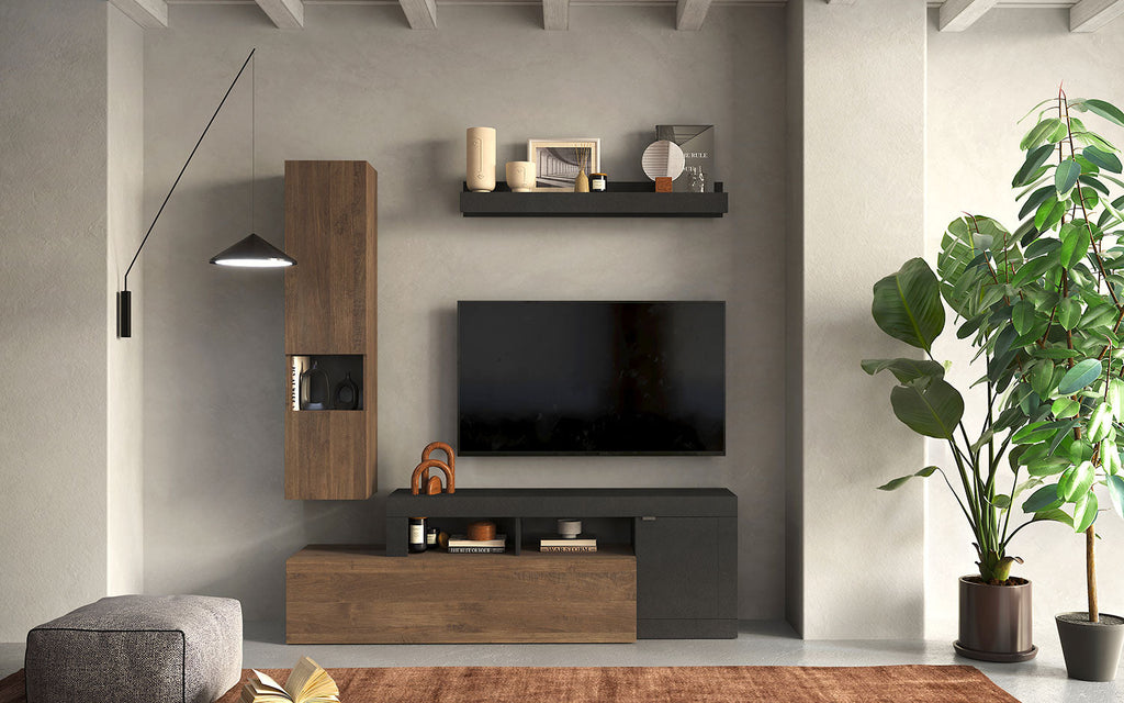 Freedom: la tua parete attrezzata su misura. Combina stile e funzionalità con un design moderno e versatile. La base con anta a battente e ribalta, il pensile e la mensola ti offrono tutto lo spazio necessario per organizzare il tuo soggiorno. Facile da montare.
