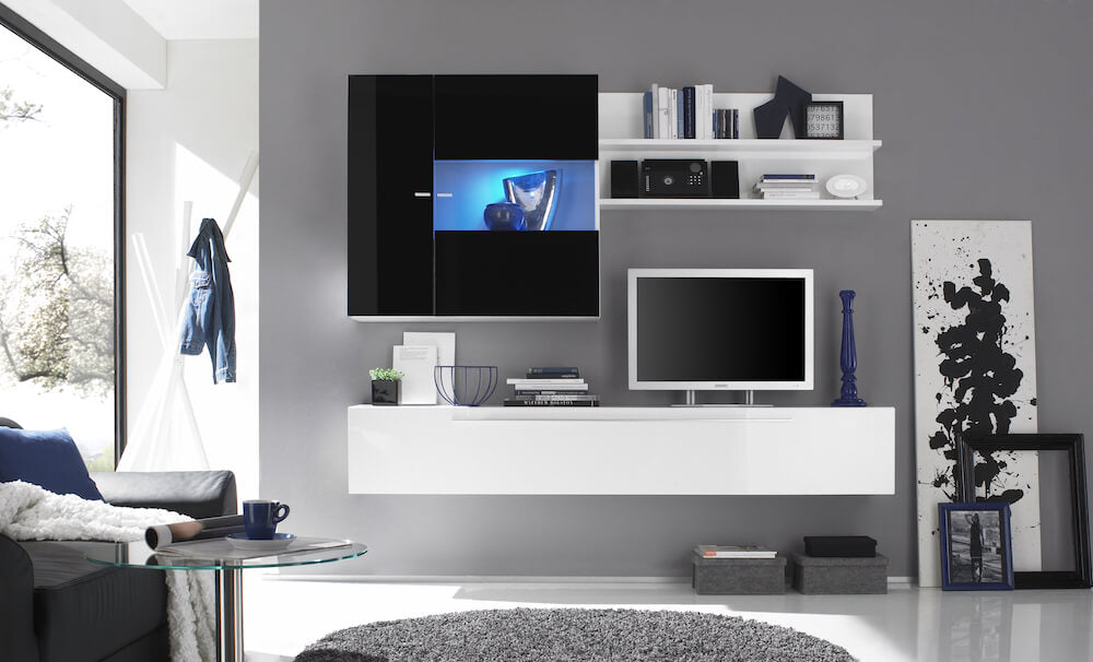 Ensemble de meubles de salon 2 meubles et double étagère 210x36x200cm TFT Primo blanc brillant et noir