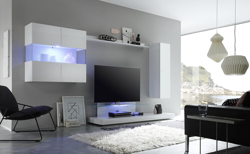 Mobilier de salon mural équipé avec 2 meubles suspendus 1 meuble TV avec étagère en verre 1 étagère 320x50x175cm TFT Line Blanc brillant