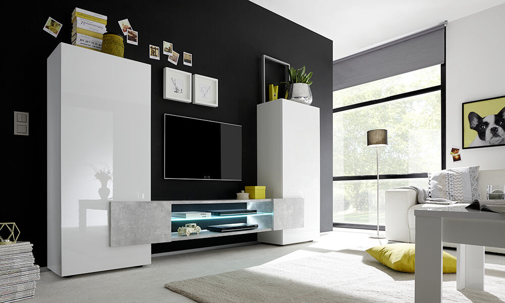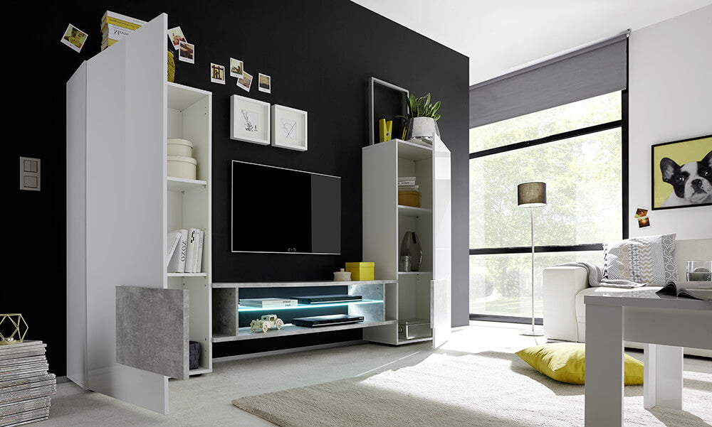 Meuble de Rangement Mural Salon avec 2 Meubles Colonnes et 1 Meuble TV en mélamine 258x37x143cm TFT Build Blanc Brillant et Ciment