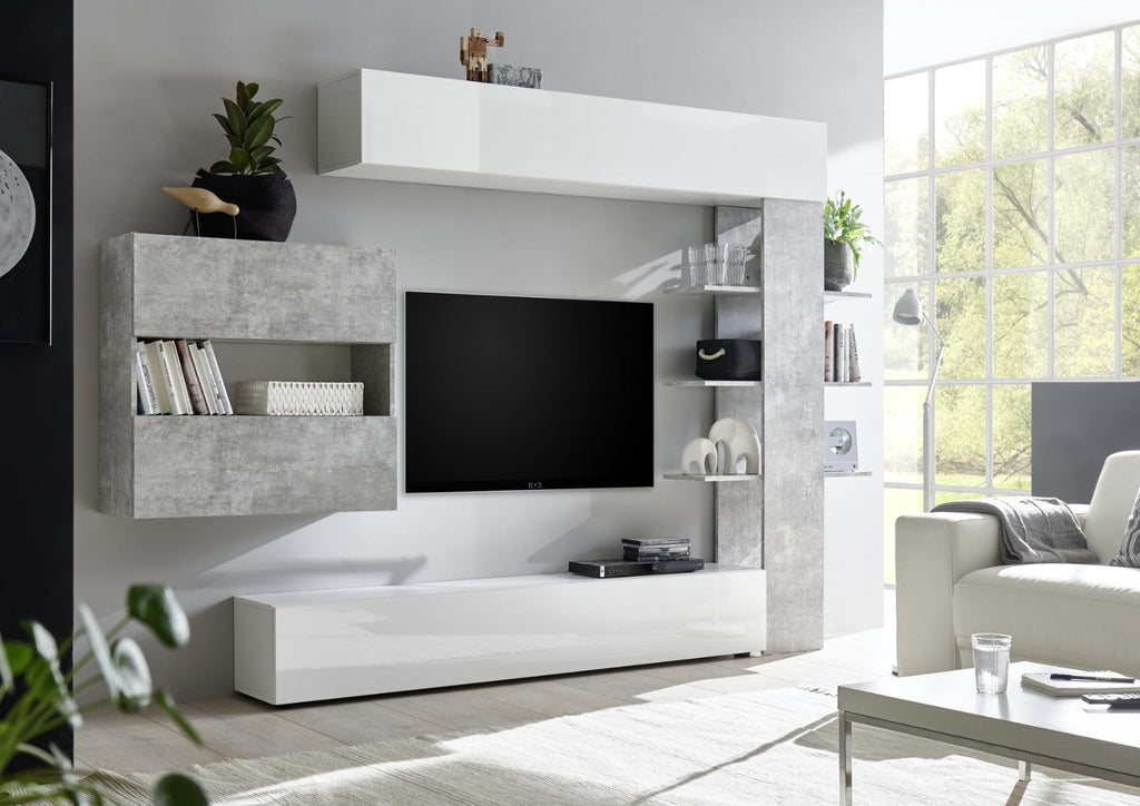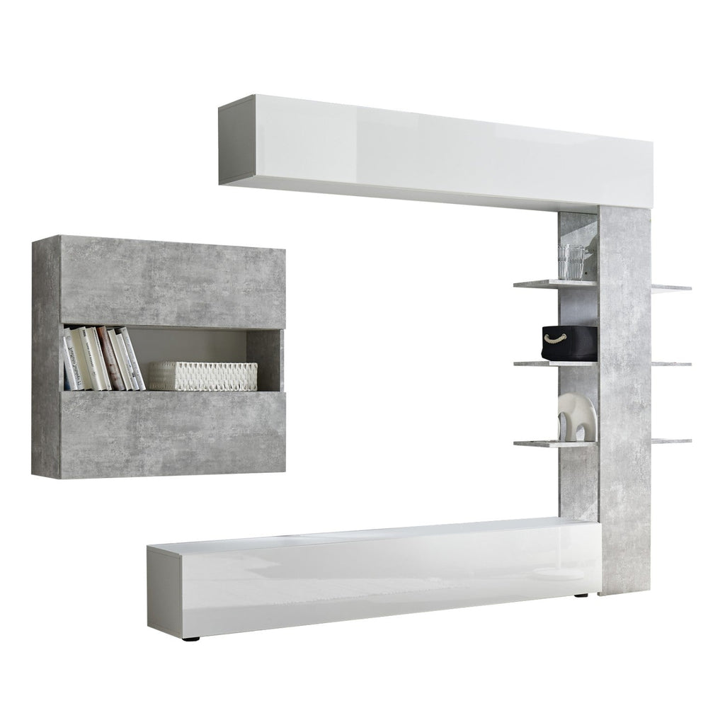 Ensemble mural meuble de salon meuble TV bibliothèque 2 éléments muraux 295x30x187 cm en bois TFT Akira 1 blanc et ciment
