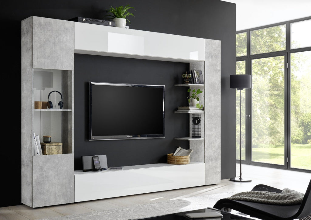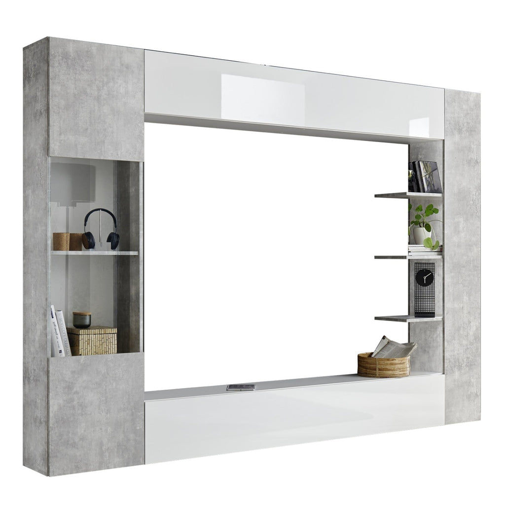 Rangement Meuble de Salon Mural Meuble TV Bibliothèque Murale et Meuble Colonne TFT Akira 2 Blanc et Ciment