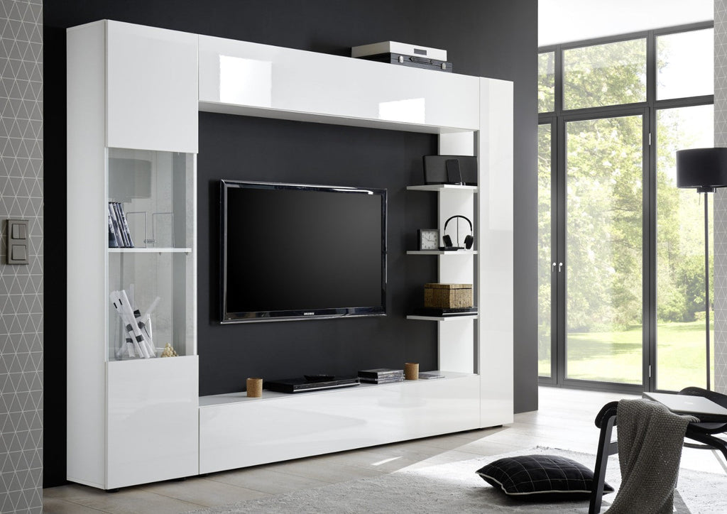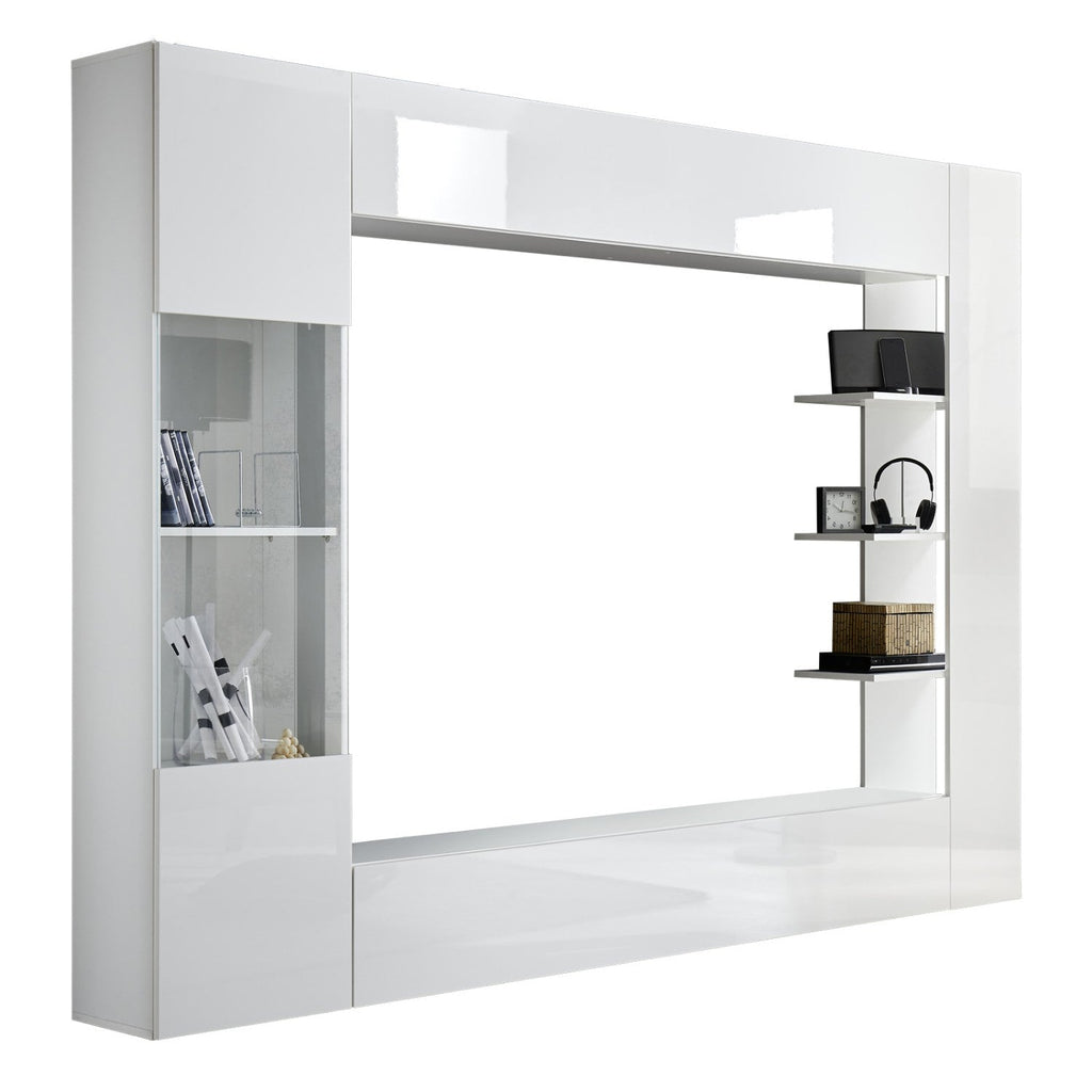 Meuble Mural Meuble de Salon Meuble TV Bibliothèque Murale Meuble Colonne 295x30x187 cm en Bois TFT Akira 2 Blanc Brillant