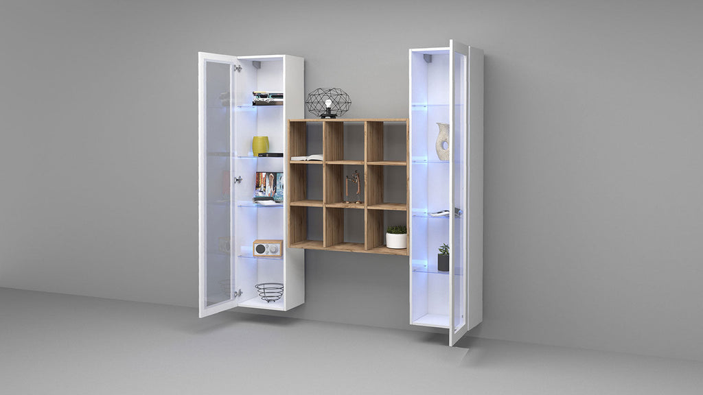 Questo soggiorno è composto da due vetrine e una libreria centrale color rovere. Le vetrine hanno un'anta con telaio e 4 ripiani in vetro. Il soggiorno MARUSKA n° 28 è in grado di adattarsi a qualsiasi stile di arredo. Viene fornito in un kit di montaggio con istruzioni semplici e dettagliate. La parete soggiorno MARUSKA n° 28 da 170 cm può essere montata sia a pavimento che sospesa, si distingue come un complemento d'arredo in grado di creare un soggiorno dal design inconfondibile e 100% Made in Italy.