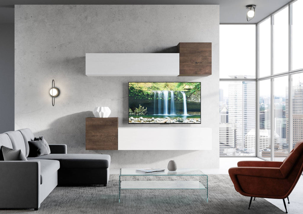 La parete attrezzata Isoka A37 è composta da due elementi semplici ripetuti in alto e in basso, sopra e sotto la TV.